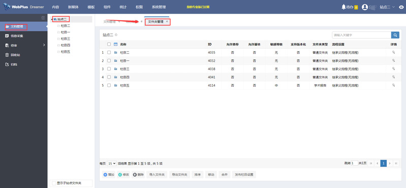 保存成功后,在内容-文档管理下,选中根节点,文件夹管理