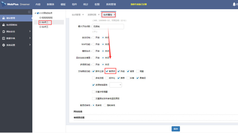 系统管理-建站管理,点击站点名称,站点属性下文档高级功能,勾选敏感词,点击“保存”