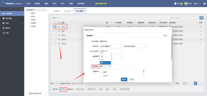 勾选文件夹,点击修改,高级属性下设置敏感等级为“高”,保存即可